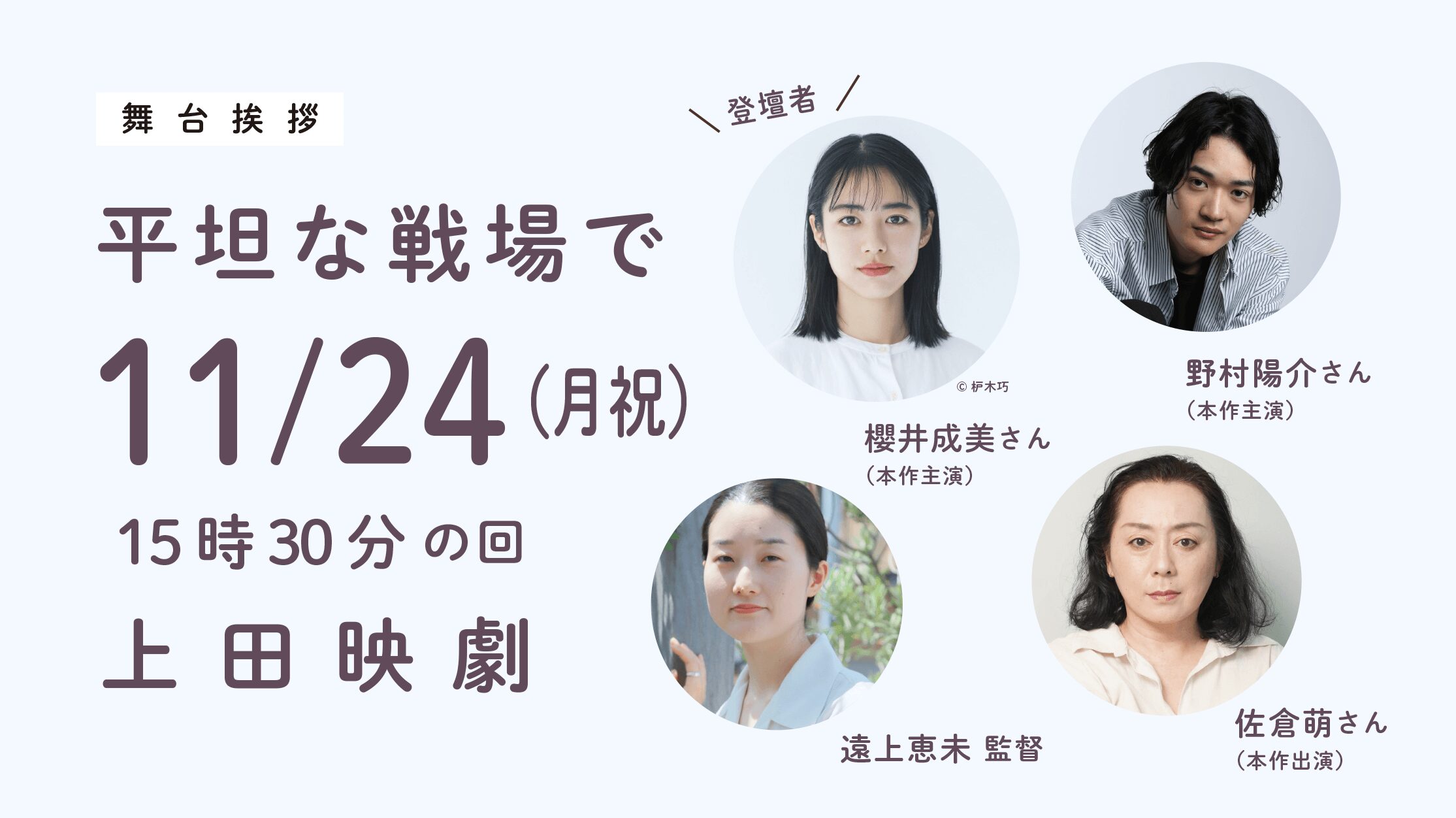 11月24日(月祝)15時30分の回の上映後、本作主演の櫻井成美さん、野村陽介さん、本作出演の佐倉萌さん、遠上恵未 監督による舞台挨拶を実施致します。...