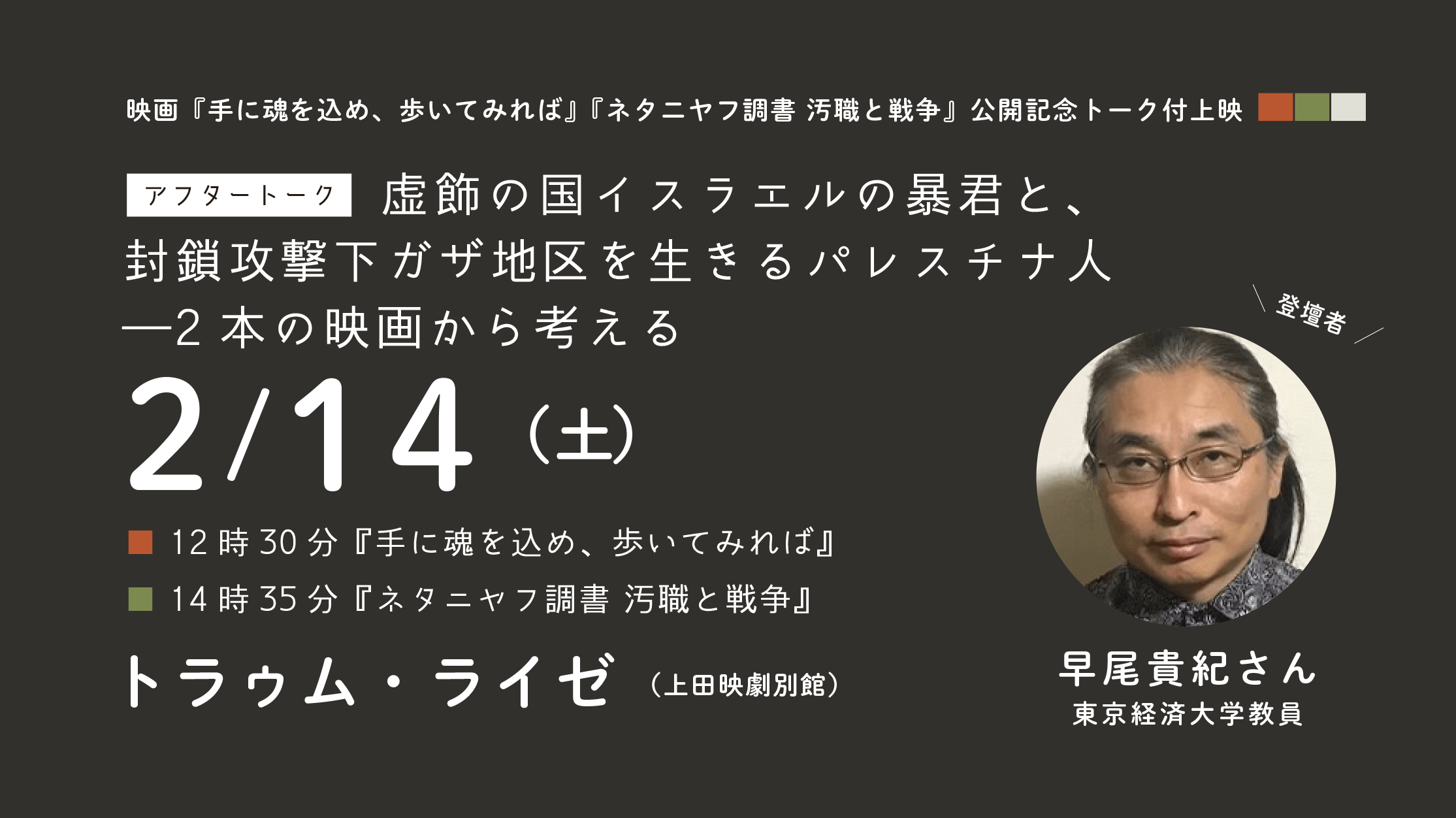 2月14日(土)、パレスチナ情勢をめぐる2本の映画『手に魂を込め、歩いてみれば』と『ネタニヤフ調書 汚職と戦争』の公開を記念して、東京経済大学教員の早...