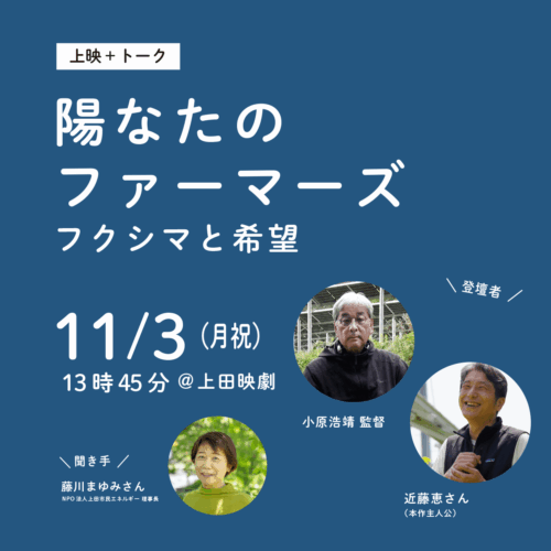 11月3日(月祝)13時45分からの回の上映後、小原浩靖 監督、近藤恵さん(本作主人公)、藤川まゆみさん(NPO法人上田市民エネルギー 理事長)による...