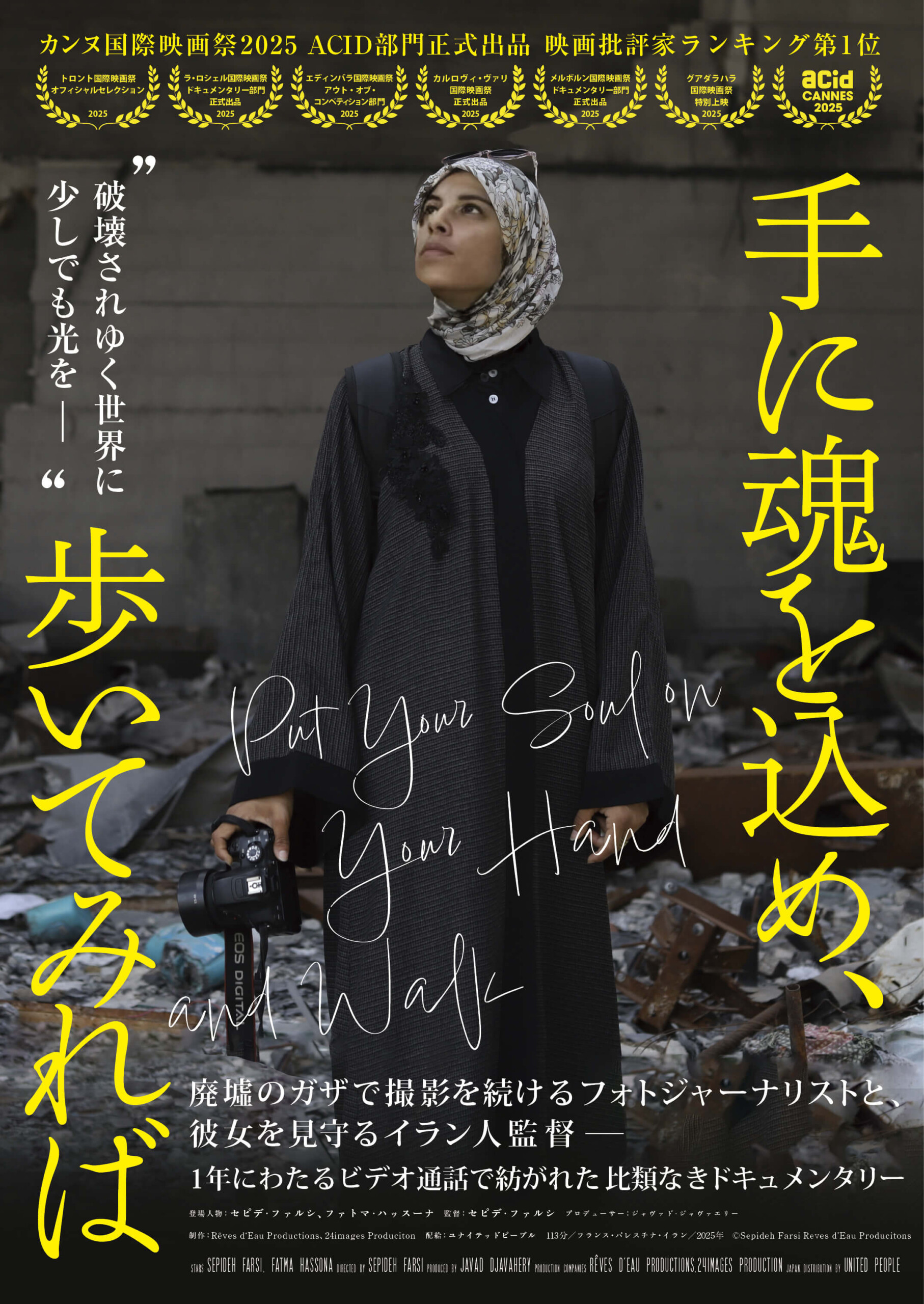 手に魂を込め、歩いてみれば【順次公開】 今後の上映作品 [上映日程]順次公開 “ 破壊されゆく世界に少しでも光を——— ”廃墟のガザで撮影を続けるフォトジャーナリストと、彼女を見守るイラン人監督———1年にわたるビデオ通話で紡がれた比類なきドキュメンタリー [STORY] イスラエルによるガザ攻撃が続いていた2024年、イラン出⾝の映画監督セピデ・ファルシは、緊急に現地の⼈々の声を届ける必要性を感じていた。しかし、ガザは封鎖されており⾏くことは出来ない。そこで、知り合ったガザ北部に暮らす24歳のパレスチナ⼈フォトジャーナリスト、ファトマ・ハッスーナとのビデオ通話を中⼼とした映画の制作を決意する。 以後、イランからフランスに亡命したため祖国に戻れない監督と、監督の娘と同じ年齢で、ガザから出られないファトマとのビデオ通話が毎⽇のように続けられた。そして、ファトマは監督にとってガザを知る⽬となり、監督はファトマが外の世界とつながる 架け橋となり、絆を築いていく。 ファトマは空爆、饑餓や不安にさらされながらも⼒強く⽣きる市⺠の姿や、街の僅かな輝きを写真に収め、スマホ越しにガザの様⼦を伝え続けた。監督が「彼⼥は太陽のような存在」と形容するように、彼⼥はいつも明るかったが、度重なる爆撃で家族や友⼈が殺されていくにつれ、表情を暗くしていく。そして悲劇はファトマをも襲う。2⼈が交流を始めて約1年後の2025年4⽉15⽇、本作のカンヌ映画祭上映決定の知らせを、ファトマは喜んだが、その翌⽇、イスラエル軍の空爆でファトマを含む家族7⼈が殺されてしまったのだ。 25歳になったばかりのファトマの死は、本⼈が「もし死ぬのなら、響き渡る死を望む」と書いたように、世界中に波紋を広げることになる。 『手に魂を込め、歩いてみれば』 [2025年/フランス・パレスチナ・イラン/113分]G 登場人物:セピデ・ファルシ、ファトマ・ハッスーナ 監督:セピデ・ファルシ プロデューサー:ジャヴァド・ジャヴァエリー 配給:ユナイテッドピープル @Sepideh Farsi Reves d’Eau Producitons ★カンヌ国際映画祭 2025 ACID 部⾨正式出品 ★映画批評家ランキング第1位 ◎文部科学省選定作品 社会教育(教材) ◎高等学校生徒・青年・成人向き 国際性(国際理解・平和) [公式サイト] unitedpeople.jp/put [上映時間] *準備中 Tweet Share Hatena Pocket RSS feedly Pin it 今後の上映作品 CROSSING 心の交差点【順次公開】 ベ・ラ・ミ 気になるあなた【順次公開】 ピックアップ記事 現在上映中の作品 佐藤さんと佐藤さん【11/28~12/18】 現在上映中の作品 現在上映中の作品 ボンヘッファー ヒトラーを暗殺しようとした牧師【11/28~... 現在上映中の作品 現在上映中の作品 落下の王国 4Kデジタルリマスター【11/28~】 現在上映中の作品 関連記事一覧 今後の上映作品 ぼくらの居場所【12/5~11】*12月の PICK UP ... 今後の上映作品 消滅世界【12/19~】 今後の上映作品 チリの闘い:武器なき民の抵抗 2Kレストア版【12/26~2... 今後の上映作品 星と月は天の穴【1/16~】 今後の上映作品 はだしのゲンはまだ怒っている【12/12~】 今後の上映作品 ブルーボーイ事件【12/12~】 今後の上映作品 モンテ・クリスト伯【1/2~8】 今後の上映作品 メーサーロシュ・マールタ監督特集 第2章【12/6~28】*...