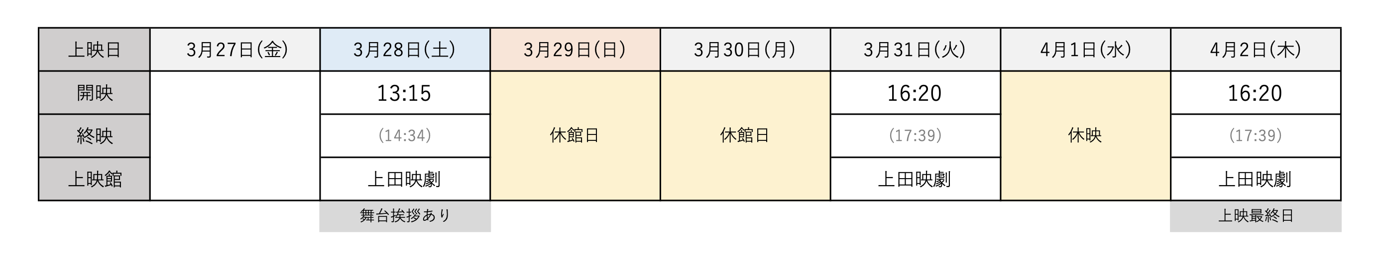 話したりない夜の果て Days gone by【3/28~4/2】*舞台挨拶あり 今後の上映作品 [上映日程]2026年3月28日(土)、31日(火)、4月2日(木) ★3月28日(土)13時15分の回の上映後、本作主演の矢島理佐さん、出演の菅原雪さん、上村奈帆 監督による舞台挨拶を実施致します “ 生きてるのが、怖かった ” [STORY] 心が折れたある時から、立ち直り方を忘れてしまった主人公・妙子。過去を言い訳に漫然と今をやり過ごす日々に生きる気力を失っていた。精神的にも生活においても依存していた彼氏・コタロウとの関係が変化していく中で、妙子はようやく自分の心の内と対峙することになる。 [INTRODUCTION] 1988年生まれの女性6人によって結成された演劇映像創作団体「88生まれの女たち」の初の長編映画で、東京の片隅に生きる同級生たちの10年間を描いたヒューマンドラマ。当初は2022年に「話したりない夜の果て」というタイトルで公開予定だったが、諸事情で一旦中止となり、その後、撮影と編集を重ねて『話したりない夜の果て Days gone by』として完成した。 88生まれの女たちとは 1988年、昭和最後の年に生まれた女性6人で集まって結成された映像演劇創作団体。移ろいうねり続ける現代を全力で生きる女性たちの姿を等身大で表現するとこを目的としている。 『話したりない夜の果て Days gone by』 [2025年/日本/16:9/カラー/5.1ch/79分] 出演:矢島理佐、安楽涼、菅原雪、仲村唯、二見悠、日高ボブ美 企画・製作:88生まれの女たち 監督・脚本・編集:上村奈帆 [公式サイト] 88-yoruhatedaysgoneby [上映時間] Tweet Share Hatena Pocket RSS feedly Pin it 今後の上映作品 私たちの話し方【4/3~】*UDCast対応 おばけ【3/27~4/1】*舞台挨拶あり/『道行き』公開記念特別上映 ピックアップ記事 現在上映中の作品 小屋番 八ヶ岳に生きる 劇場版【2/20~3/26】 現在上映中の作品 現在上映中の作品 ぼくの名前はラワン【3/20~26】*「週末こども映画館」対... 現在上映中の作品 現在上映中の作品 ナースコール【3/20~4/2】 現在上映中の作品 関連記事一覧 今後の上映作品 海辺の恋【5/22~28】*ロカルノ国際映画祭・批評家賞受賞... 今後の上映作品 医の倫理と戦争【3/27~4/9】 今後の上映作品 殺し屋1 4K【6/5~】 今後の上映作品 ツイッギー【5/8~】 今後の上映作品 ヴィットリア 抱きしめて【5/8~】 今後の上映作品 ホールディング・リアット【3/27~4/9】*ベルリン国際映... 今後の上映作品 ロッコク・キッチン【4/10~】*舞台挨拶あり 今後の上映作品 道行き【4/3~9】