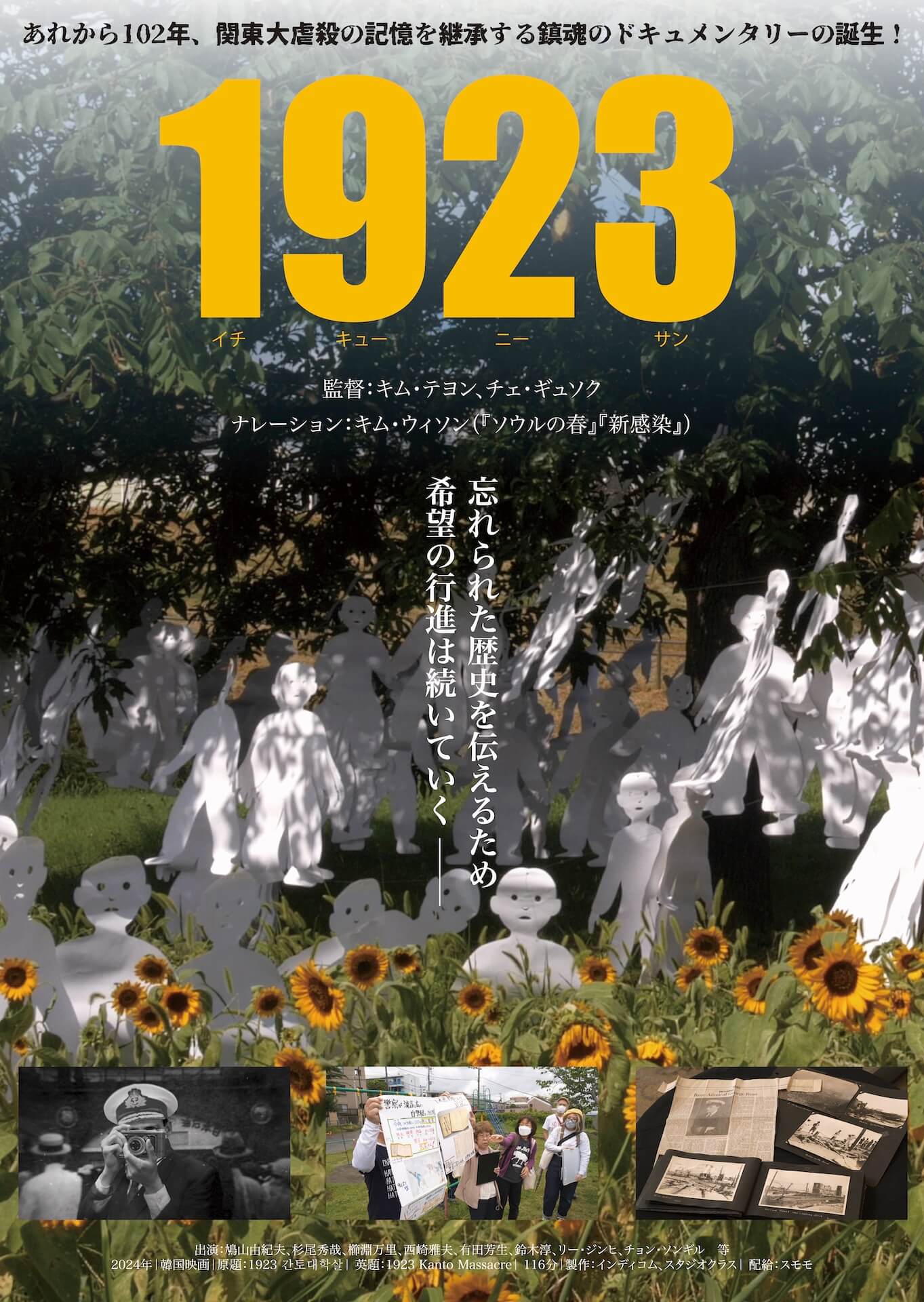1923【4/3~】 今後の上映作品 [上映日程]2026年4月3日(金) 〜 *休映:4/6、ほか “ 忘れられた歴史を伝えるための希望の行進は続いていく——— ”あれから102年、関東大虐殺の記憶を継承する鎮魂のドキュメンタリーの誕生! [INTRODUCTION] 1923年9月1日。大震災によって関東地方一帯が大きな被害を受けた直後、日本国内では混乱と恐怖の中で根拠のない流言 ──「朝鮮人が暴動を起こす」というデマ── が広がった。 本作は、その震災直後に起きた在日朝鮮人への集団的暴力・虐殺、すなわち関東大虐殺の実態を日韓両国での膨大な取材と、新資料の検証を通じて再構成し、暴力がどのようにして起きたのか、誰が加害者だったのか──民間の自警団、警察、軍など関与の構図を明らかにするとともに、犠牲者はなぜ「異民族」あるいは「外国人」とみなされ、命を奪われたのかが描き出される。 さらに100年以上もの間、なぜこの「大虐殺」の事実が公の歴史としてきちんと扱われてこなかったのか、なぜ隠蔽あるいは見過ごされてきたのか──その背景にある差別意識、権力構造、歴史認識の問題にも迫り、被害者の遺族や市民活動家、研究者たちの声を通じて、「忘れ去られた真実」を掘り起こしていく。 犠牲者数「約6,661人」とされるこの事件を、「歴史の闇」として扱うのではなく、後世へ継承されるべき記憶とするための鎮魂のドキュメンタリーである。 『1923』 [2024年/韓国/116分] 監督:キム・テヨン、チェ・ギュソク ナレーション:キム・ウィソン 出演:鳩山由紀夫、杉尾秀哉、櫛淵万里、西崎雅夫、有田芳生、鈴木淳、リー・ジンヒ、チョン・ソンギル 等 原題:1923 간토대학살|英題:1923 Kanto Masscre 製作:インディコム、スタジオクラス 配給:スモモ ©︎ 2024 Indecom [公式サイト] 1923 [上映時間] *準備中 Tweet Share Hatena Pocket RSS feedly Pin it 今後の上映作品 道行き【4/3~9】 エリス&トム ―ボサノヴァ名盤誕生秘話―【4/3~】 ピックアップ記事 現在上映中の作品 たしかにあった幻【3/13~26】 現在上映中の作品 現在上映中の作品 Shiva Baby シヴァ・ベイビー【3/13~19】 現在上映中の作品 現在上映中の作品 小屋番 八ヶ岳に生きる 劇場版【2/20~3/26】 現在上映中の作品 関連記事一覧 今後の上映作品 クイーンダム/誕生【3/27~】 今後の上映作品 道行き【4/3~9】 今後の上映作品 ボストン市庁舎【4/10~】*上田市長・市議会議員選挙 関連... 今後の上映作品 ギョンアの娘【3/27~】*入場者プレゼントあり 今後の上映作品 ザッケン!【5/29~】 今後の上映作品 愚か者の身分【3/20~26】 今後の上映作品 ツーリストファミリー【5/15~】 今後の上映作品 ジョン・クランコ バレエの革命児【4/10~】