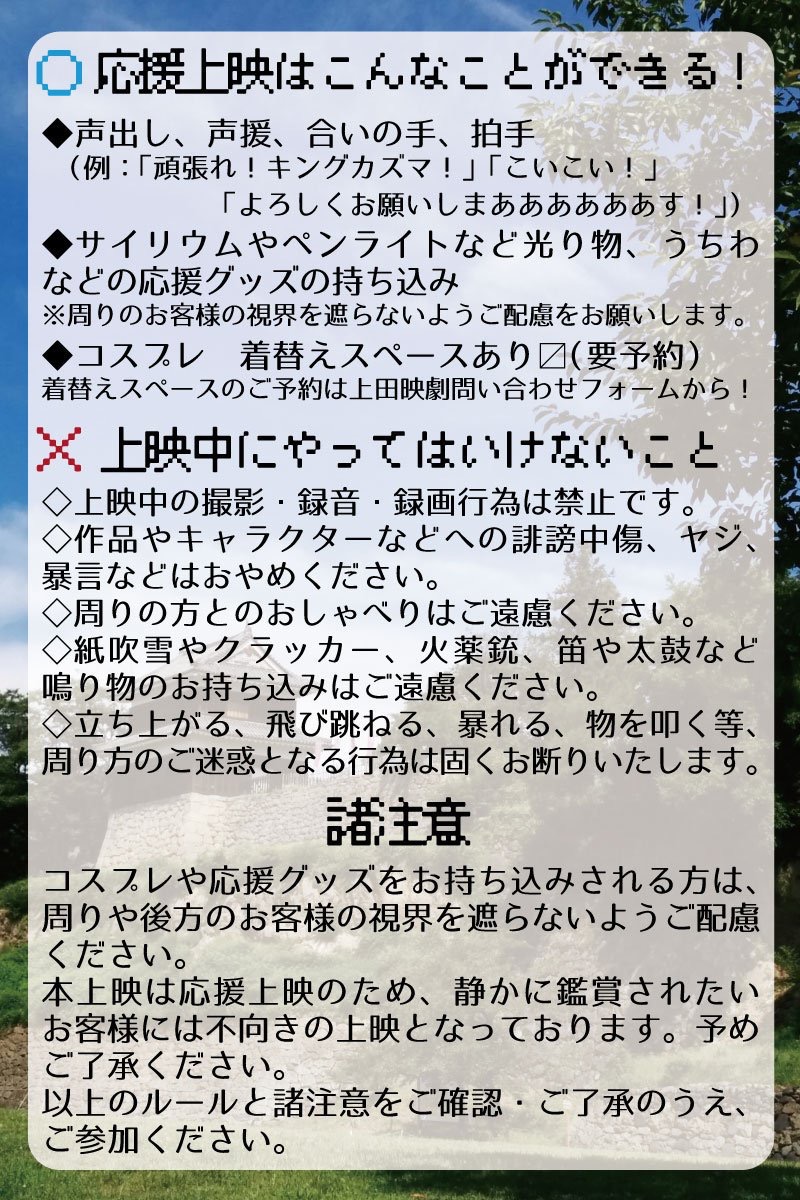 『サマーウォーズ応援上映 in 信州上田』開催決定! お知らせ 祝!サマーウォーズ公開10周年! 10年分の感謝を込めて一緒に「よろしくお願いしまああああす」と叫びませんか? 2009年に公開された細田守監督の映画『サマーウォーズ』。 公開当時はまだ応援上映という文化が花開く前だったため、 『サマーウォーズ』の応援上映は開催されませんでした。 しかし、10年の時を経て映画の見方も変わり、 応援上映という文化が根付きつつある今だからこそ『サマーウォーズ』応援上映を開催したい! そんな熱い思いを持った有志たちで「サマーウォーズ応援上映有志の会」を結成し、 『サマーウォーズ』応援上映を開催する運びとなりました! 『サマーウォーズ』の舞台・長野県上田市で一緒に「こいこい!」しませんか? 【『サマーウォーズ応援上映 in 信州上田』におけるルールと諸注意】 ◎OKなこと ・声出し、声援、合いの手、拍手 (例:「頑張れ!キングカズマ!」「こいこい!」「よろしくお願いしまああああす!」) ・サイリウムやペンライトなど光り物 ・うちわなどの応援グッズの持ち込み (周りのお客様の視界を遮らないようご配慮お願いします) ・コスプレ:着替えスペース有り ※着替えスペースには限りがあるため要事前予約制。定員になり次第予約受付を締め切ります。 ※着替えスペースのご予約はこちらから。 (題名に『サマウォ応援上映:着替えスペース利用希望』と必要事項・希望利用人数を添えてお申し込みください) ×NGなこと ・上映中の撮影・録音・録画行為は禁止です。 ・作品やキャラクターなどへの誹謗中傷、ヤジ、暴言などはおやめください。 ・周りの方とのおしゃべりはご遠慮ください。 ・紙吹雪やクラッカー、火薬銃、笛や太鼓など鳴り物のお持ち込みはご遠慮ください。 ・立ち上がる、飛び跳ねる、暴れる、物を叩く等、周り方のご迷惑となる行為は固くお断りいたします。 これらの行動が過剰に行われた場合、上映中止となる場合がございます。 □その他諸注意 ・コスプレや応援グッズをお持ち込みされる方は、周りや後方のお客様の視界を遮らないようご配慮ください。 ・本上映は応援上映のため、静かに鑑賞されたいお客様には不向きの上映となっております。予めご了承ください。 以上のルールと諸注意をご確認・ご了承のうえ、ご参加ください。 【開催概要】『サマーウォーズ応援上映 in 信州上田』 【日時】8/12(月) 13時開場/13時30分開演(前説:10分) 【場所】上田映劇 (長野県上田市中央2-12-30/TEL:0268-22-0269) 【料金】一般 2000円/特別会員及び高校生以下 1000円(Pass Market/劇場窓口にて) チケットのお求めはこちらから→〈https://passmarket.yahoo.co.jp/event/show/detail/0194cx10disgk.html〉 ※整理番号順でのご入場、自由席となります。開場予定時刻までにお集まりください。 ※劇場窓口販売のチケットをお持ちの方を優先入場致します。ご了承ください。 ※Pass Market(インターネットチケット)にて お買い求めいただいたお客様のチケットに表記されている「A-数字」「B-数字」は、 座席番号ではなく整理番号となります。 ※ご予約後のチケットの変更・キャンセルはいたしかねます。何卒ご了承ください。 ※当日券は空席が出た場合に限り販売致します。 ※転売目的でのご購入は、固くお断り致します。 ※15分以上遅れての途中入場はお断りさせて頂きますので、ご了承ください。 ※特別興行の為、各種招待券、年間パスポートはご利用いただけません。 ※当館専用の駐車場はございません。近隣のコインパーキングをご利用ください。 (近隣のコインパーキング情報はこちらから) 開催概要 ルールと諸注意 『サマーウォーズ応援上映 in 信州上田』 (#サマウォ応援上映)をよろしくお願いしまぁぁぁぁぁぁぁぁす! 【主催】サマーウォーズ応援上映有志の会【共催】上田映劇 ©2009 SUMMERWARS FILM PARTNERS Tweet Share Hatena Pocket RSS feedly Pin it お知らせ さらば愛しきアウトロー 工作 黒金星と呼ばれた男 ピックアップ記事 現在上映中の作品 おくびょう鳥が歌うほうへ【2/6~12】 現在上映中の作品 現在上映中の作品 PROJECT Y【1/30~2/12】 現在上映中の作品 現在上映中の作品 安楽死特区【2/6~12】 現在上映中の作品 関連記事一覧 お知らせ 上田映劇ジャーナル(vol.42)2021年2月号 お知らせ #旅する映劇はんこプロジェクトー作品リストー お知らせ 『子供はわかってあげない』『キツツキと雨』沖田修一監督 舞台... お知らせ 『ボストン1947』アフタートークイベント開催のお知らせ。 お知らせ BS松竹東急 開局記念特番「寅さんファンクラブ」放送──当館... お知らせ 【終了しました】『銀鏡 SHIROMI』舞台挨拶付き上映 開... お知らせ 映画『へんしんっ!』上映&トークセッション〜信州アーツカウン... お知らせ 【予約受付終了】復活「映画めし」!『ブータン 山の教室』の上...