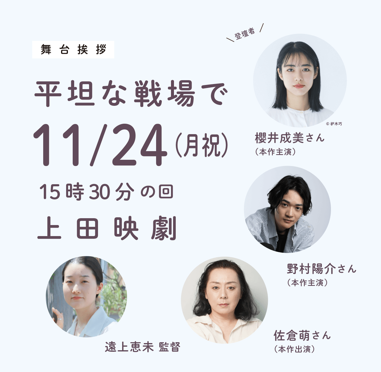 11月24日(月祝)15時30分の回の上映後、本作主演の櫻井成美さん、野村陽介さん、本作出演の佐倉萌さん、遠上恵未 監督による舞台挨拶を実施致します。