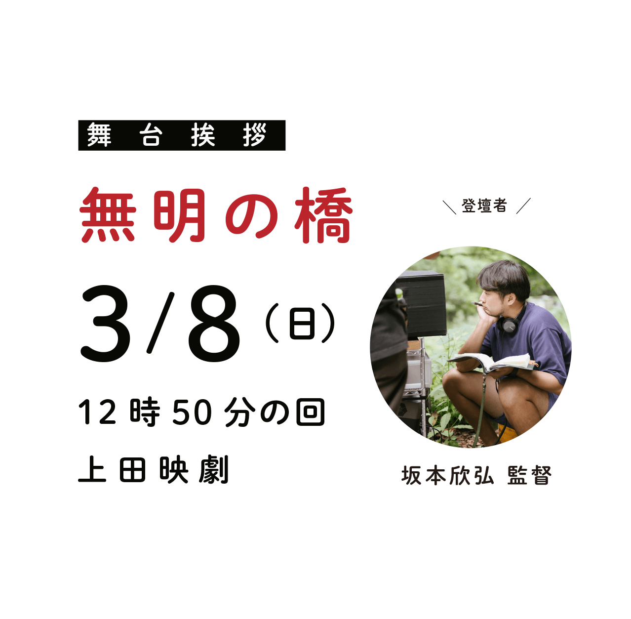 3月8日(日)12時50分の回の上映後、坂本欣弘 監督による舞台挨拶を実施致します。