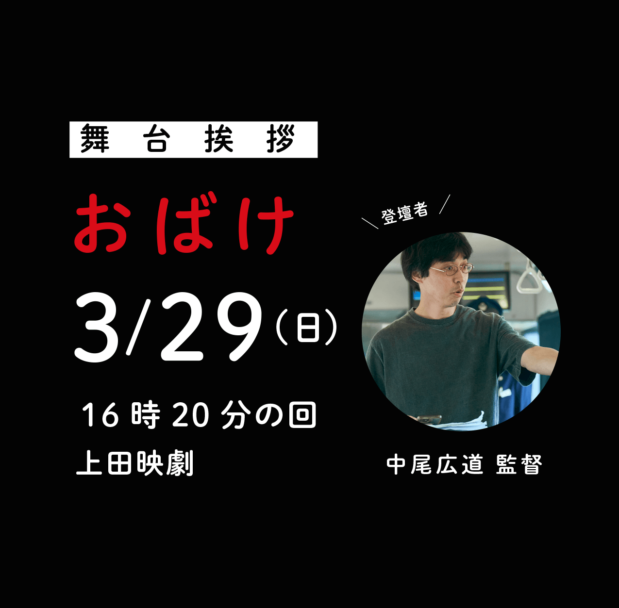 3月29日(日)16時20分の回の上映後、中尾広道 監督による舞台挨拶を実施致します。