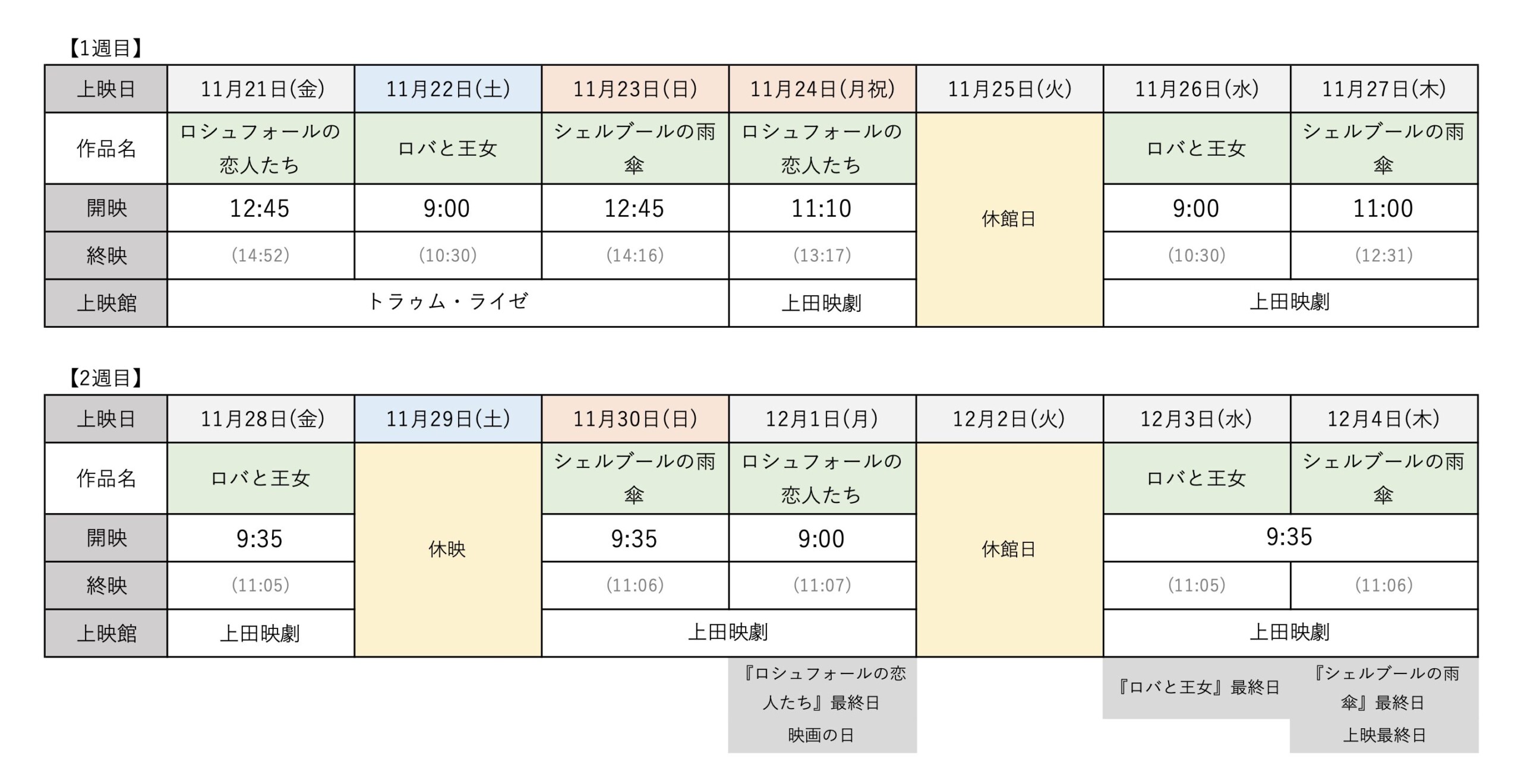 ミシェル・ルグラン&ジャック・ドゥミ レトロスペクティブ【11/21~12/4】*『ミシェル・ルグラン 世界を変えた音楽家』公開記念特集上映 現在上映中の作品 [上映日程]2025年11月21日(金) 〜 12月4日(木) *休映:11/25、29、12/2 映画史上に燦然と輝くコンビ、ミシェル・ルグランとジャック・ドゥミ不朽の名作3選 ミシェル・ルグラン 1932年2月24日、パリ生まれ。フランスを代表する作曲家、編曲家、ピアニスト、歌手、指揮者。11歳で、パリ国立高等音楽院に入学し、アンリ・シャランやナディア・ブーランジェに師事。1954年、22歳の時に初のアルバム「アイ・ラヴ・パリ」をリリースし、世界的な成功を収める。1958年にマイルス・デイヴィス、ビル・エヴァンス、ジョン・コルトレーンらと共演したジャズ・アルバム「ルグラン・ジャズ」はベストセラーになった。 映画音楽の作曲家としてのキャリアは、1954年のアンリ・ベルヌイユ監督作品『過去をもつ愛情』から。その後、ヌーヴェルヴァーグの映画人たち、そしてジャック・ドゥミと出会う。『シェルブールの雨傘』と『ロシュフォールの恋人たち』の映画音楽は彼に世界的な評価をもたらした。1967年から1969年まではロサンゼルスに移住し、ノーマン・ジュイソン『華麗なる賭け』、ジョン・スタージェス『北極の基地/潜航大作戦』、シドニー・ポラック『大反撃』、リチャード・ブルックス『ハッピーエンド/幸せの彼方に』の映画音楽を作曲。 フランスに戻った後、ジャン=ポール・ラプノー『コニャックの男』、ロバート・マリガン『おもいでの夏』、クロード・ルルーシュ『愛と哀しみのボレロ』、バーブラ・ストライサンド『愛のイエントル』、アービン・カーシュナー『ネバーセイ・ネバーアゲイン』などがある。生涯で3つのオスカーを獲得。クラシックとジャズという異なる文化の要素を組み合わせたミシェル・ルグランは、独創的で華麗な作曲でジャンルの垣根をなくした。2019年1月26日に永眠。 提供:ハピネット・メディアマーケティング 配給:ハピネットファントム・スタジオ/アンプラグド [上映作品] 『シェルブールの雨傘』(1964) 『ロシュフォールの恋人たち』(1967) 『ロバと王女』(1970) [公式サイト] unpfilm.com/legrand/retrospective [上映時間] 作品紹介 『シェルブールの雨傘』Les Parapluies de Cherbourg [1964年/フランス/ビスタ/カラー/2.0chステレオ/91分] 監督・脚本・作詞:ジャック・ドゥミ 音楽・作曲:ミシェル・ルグラン 撮影:ジャン・ラビエ 美術:ベルナール・エヴァン 衣裳:ジャクリーヌ・モロー 編集:アンヌ・マリー・コトレ 製作:マグ・ボダール 出演:カトリーヌ・ドヌーヴ、二ーノ・カステルヌオーヴォ、マルク・ミシェル アンヌ・ヴェルノン、エレン・ファルナー ©Ciné-Tamaris 1993 第17回カンヌ国際映画祭グランプリを受賞した1964年の傑作ミュージカル。全編音楽のみで展開し、セリフがすべて歌詞になっているという、 映画としては画期的な形式で制作された。ミシェル・ルグランによる音楽が評判となり主題歌も大ヒット。 カトリーヌ・ドヌーヴの出世作として広く知られている。歌唱部分は全て歌手による吹替えが行われている。 フランス北西部の港町、シェルブールで、ささやかながら美しい恋をはぐくむ自動車修理工の若者ギイと傘屋の少女ジュヌヴィエーヴ。恋に恋する年頃のジュヌヴィエーヴに未亡人の母エムリーは心配顔。出かけるたびにうそをつきながらもジュヌヴィエーヴはギイと会う時間が嬉しかった。だがある日、アルジェリア戦争の召集令状がギイに届き、2人ははなればなれに引き裂かれるのだった。 フランス北西部の港町、シェルブールで、ささやかながら美しい恋をはぐくむ自動車修理工の若者ギイと傘屋の少女ジュヌヴィエーヴ。恋に恋する年頃のジュヌヴィエーヴに未亡人の母エムリーは心配顔。出かけるたびにうそをつきながらもジュヌヴィエーヴはギイと会う時間が嬉しかった。だがある日、アルジェリア戦争の召集令状がギイに届き、2人ははなればなれに引き裂かれるのだった。 ★第17回カンヌ国際映画祭 グランプリ 『ロシュフォールの恋人たち』Les Demoiselles de Rochefort [1967年/フランス・アメリカ/シネスコ/カラー/2.0chステレオ/127分] 監督・脚本・作詞:ジャック・ドゥミ 音楽・作曲:ミシェル・ルグラン 撮影:ギスラン・クロケ 美術:ベルナール・エヴァン 衣裳:ジャクリーヌ・モロー マリー・クロード・フーケ 編集:ジャン・アモン 振付:ノーマン・メーン 製作:マグ・ボダール 出演:カトリーヌ・ドヌーヴ、フランソワーズ・ドルレアック、ジーン・ケリー、ジョージ・チャキリス、ジャック・ぺラン、ダニエル・ダリュー、ミシェル・ピコリ、グローヴァー・デイル ©Ciné-Tamaris 1996 『シェルブールの雨傘』で世界的大スターとなったカトリーヌ・ドヌーヴと 実姉であるフランソワーズ・ドルレアックが姉妹を演じ話題になった本格的ミュージカル。 『雨に歌えば』のジーン・ケリー、『ウエスト・サイド物語』のジョージ・