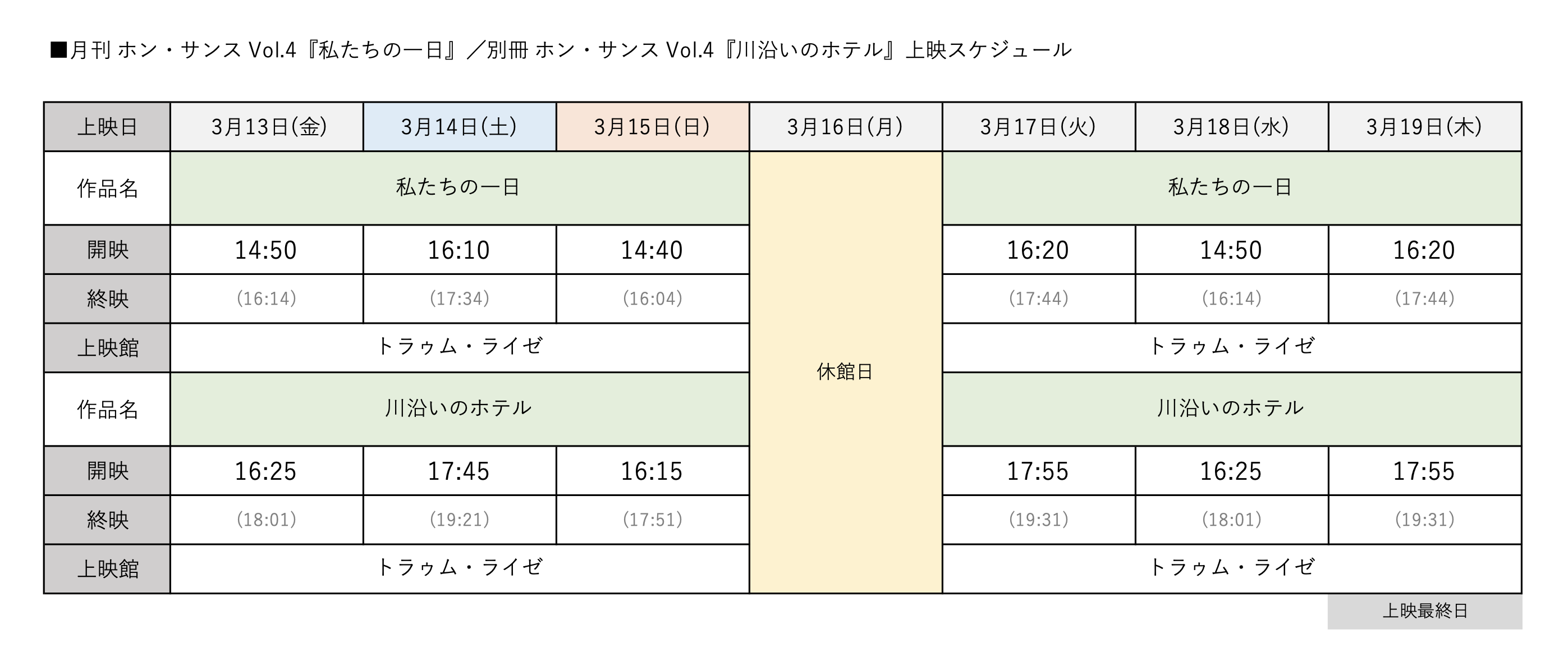 川沿いのホテル【3/13~19】*別冊 ホン・サンス Vol.4/スタンプラリーあり 現在上映中の作品 [上映日程]2026年3月13日(金) 〜 19日(木) *休映:3/16 [INTRODUCTION] 韓国の名匠ホン・サンス監督の23作目となる長編作品で、キム・ミニとの6本目となるコラボレーション作品。漢江沿いのホテルでのある冬の一日を舞台にした会話劇をモノクロ映像で描く。2020年「カイエ・デュ・シネマ」誌ベストテン第6位に選ばれ、第68回ロカルノ国際映画祭ではキ・ジュボンが最優秀男優賞を受賞。日本では第19回東京フィルメックスのオープニング作品として上映された。 [STORY] ある冬の日、漢江沿いにある静かなホテルに滞在している老詩人ヨンファンは、何となく自分が死ぬような気がして、疎遠となっていた2人の息子をホテルに呼び出した。しかし、親子は同じホテルの違う場所で待っていて、なかなか出会えない。ようやく互いを発見した親子は、ホテルのコーヒーショップで久々に会話を交わすが、話がうまくかみ合わない。一方、ホテルの別の部屋では、失恋して傷心の美女サンヒが滞在している。ヨンファンは彼女を気に入ってその後を追うが……。 『川沿いのホテル』 [2018年/韓国/モノクロ/96分] 出演:キ・ジュボン、キム・ミニ 英題:Hotel By The River 協力:JAIHO ★第68回ロカルノ国際映画祭最優秀男優賞(キ・ジュボン)受賞 [公式サイト] gekkan-hongsangsoo [上映時間] ▼同時公開!月刊 ホン・サンス Vol.4『私たちの一日』についてはこちらから Tweet Share Hatena Pocket RSS feedly Pin it 現在上映中の作品 私のすべて 私たちの一日【3/13~19】*月刊 ホン・サンス Vol.4/スタンプラ... ピックアップ記事 現在上映中の作品 私たちの一日【3/13~19】*月刊 ホン・サンス Vol.... 現在上映中の作品 現在上映中の作品 花緑青が明ける日に【3/6~4/2】*UDCast対応/入場... 現在上映中の作品 現在上映中の作品 ポーラX【3/13~19】*4Kレストア版 現在上映中の作品 関連記事一覧 現在上映中の作品 小屋番 八ヶ岳に生きる 劇場版【2/20~3/26】 現在上映中の作品 私たちの一日【3/13~19】*月刊 ホン・サンス Vol.... 現在上映中の作品 パンダのすごい世界【3/9~26】*日本語ナレーション版/入... 現在上映中の作品 Shiva Baby シヴァ・ベイビー【3/13~19】 現在上映中の作品 長安のライチ【3/13~26】*入場者プレゼントあり 現在上映中の作品 ネリーに気をつけろ!ネリー・カプラン レトロスペクティヴ【3... 現在上映中の作品 役者になったスパイ【3/13~19】 現在上映中の作品 ポーラX【3/13~19】*4Kレストア版