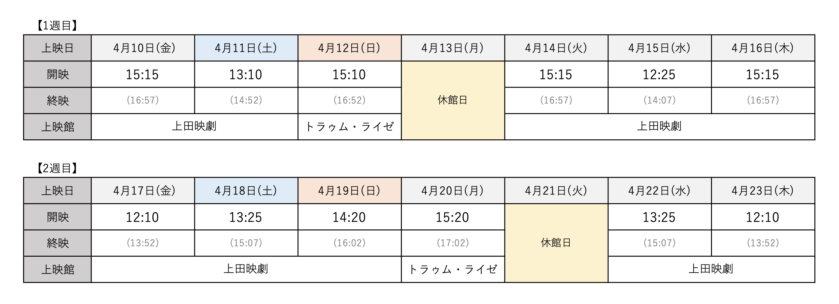 かもめ食堂【4/10~23】*特別興行作品/入場者特典あり/公開20周年記念リバイバル上映 現在上映中の作品 [上映日程]2026年4月10日(金) 〜 23日(木) *休映:4/13、21、ほか “ ハラゴシラエして歩くのだ。”かもめ食堂。それはフィンランドのヘルシンキにありました。 [INTRODUCTION] 『かもめ食堂』は、フィンランド・ヘルシンキの街角で小さな食堂を営む日本人女性のサチエと店を訪れる個性豊かな客たちとの、ほのぼのとした交流の日々を描いたハートウォーミングなドラマ。 何か大きな事件が起こるわけではない日常、食事や会話、何気ない時間の積み重ねが心をゆっくりとほどいていく。北欧の柔らかい光と空気に包まれた映像、個性豊かなキャラクターたちが奏でる穏やかなアンサンブルは、今なお多くのファンに愛され続けている。 監督・脚本を手がけるのは『バーバー吉野』で一躍注目を集め、本作以降も『めがね』『トイレット』『レンタネコ』など、独自のリズムで日常を描き続けてきた荻上直子。本作では、北欧フィンランドでの全編ロケを敢行した。主演は小林聡美、片桐はいり、もたいまさこ、人気俳優3人が集結。唯一無二の個性が自然体で交わり、本作ならではの穏やかな空気を生み出している。 さらに、物語を支える重要な存在として、フードスタイリスト・飯島奈美が手掛ける料理の数々も大きな見どころ。丁寧に用意される温かい食事の風景は記憶に残るシーンとなっている。またスチールはフォトグラファーの高橋ヨーコ、当時のパンフレットはグラフィックデザイナーの大島依提亜が手掛けており、現在も数多くの作品やメディアで活躍する面々が集結していることにも注目したい。 [STORY] 異国の地フィンランドでサチエが始めた「かもめ食堂」の看板メニューは、素朴なおにぎりだった。開店当初はほとんど客が訪れない静かな日々。それでも変わらぬペースで店を営むサチエのもとに、偶然の出会いをきっかけに少し不思議で温かい人々が集いはじめる──。 『かもめ食堂』 [2005年/日本/102分] 出演者:小林聡美、片桐はいり、もたいまさこ、ヤルッコ・ニエミ、タリア・マルクス、マルック・ペルトラ 監督・脚本:荻上直子 原作:群ようこ 主題歌・挿入歌:井上陽水 配給:Filmarks、日活 © 2006 かもめ商会 [鑑賞料金] 特別興行作品につき 一律 ¥1,600 *一切の割引サービス利用不可 [上映時間] 『かもめ食堂』復刻パンフレット 2006年公開当時に販売されたパンフレットをもとに、可能な限り当時のまま公開20周年記念リバイバル上映用に復刻したパンフレット。かもめ食堂のメニューやレシピ、プロダクションノートやエッセイなどと共に高橋ヨーコさん撮影のスチール写真を多数掲載、作品の世界がさらに味わい深くなる読み応えの一冊です。 価格:¥1,500(税込) 『かもめ食堂』入場者プレゼント:復刻ネームタグ 『かもめ食堂』の入場者に先着・限定数でプレゼントされるのは、復刻ネームタグ。このネームタグは、2006年公開当時に大きな話題となったパンフレットに付属していたものを、今回のリバイバル上映のために可能な限り当時のまま復刻したアイテムです。パンフレットの持ち手部分に取り付けることで、『かもめ食堂』の世界観をより一層お楽しみいただける特別なアイテムとなっています。 ※画像はイメージです。 ※復刻パンフレット本体はプレゼントの対象ではありません。 ※お一人様1回のご鑑賞につき1点の配布。 ※先着・数量限定のため、配布期間内でもなくなり次第終了となります。 ※劇場により数に限りがあります、あらかじめご了承ください。 ※特典は非売品になります。転売はご遠慮ください。 Tweet Share Hatena Pocket RSS feedly Pin it 現在上映中の作品 私たちの話し方【4/3~16】*UDCast対応 ピックアップ記事 現在上映中の作品 私たちの話し方【4/3~16】*UDCast対応 現在上映中の作品 現在上映中の作品 決断するとき【4/3~16】 現在上映中の作品 現在上映中の作品 フェザーズ その家に巣食うもの【4/10~23】*入場者プレ... 現在上映中の作品 関連記事一覧 現在上映中の作品 金子文子 何が私をこうさせたか【4/10~23】*舞台挨拶あ... 現在上映中の作品 Tokyo Melody Ryuichi Sakamoto ... 現在上映中の作品 決断するとき【4/3~16】 現在上映中の作品 1923【4/3~15】*入場者プレゼントあり 現在上映中の作品 愛がきこえる【4/3~15】*入場者プレゼントあり 現在上映中の作品 ジョン・クランコ バレエの革命児【4/10~23】 現在上映中の作品 ロッコク・キッチン【4/10~23】*舞台挨拶あり/うえだ子... 現在上映中の作品 私たちの話し方【4/3~16】*UDCast対応