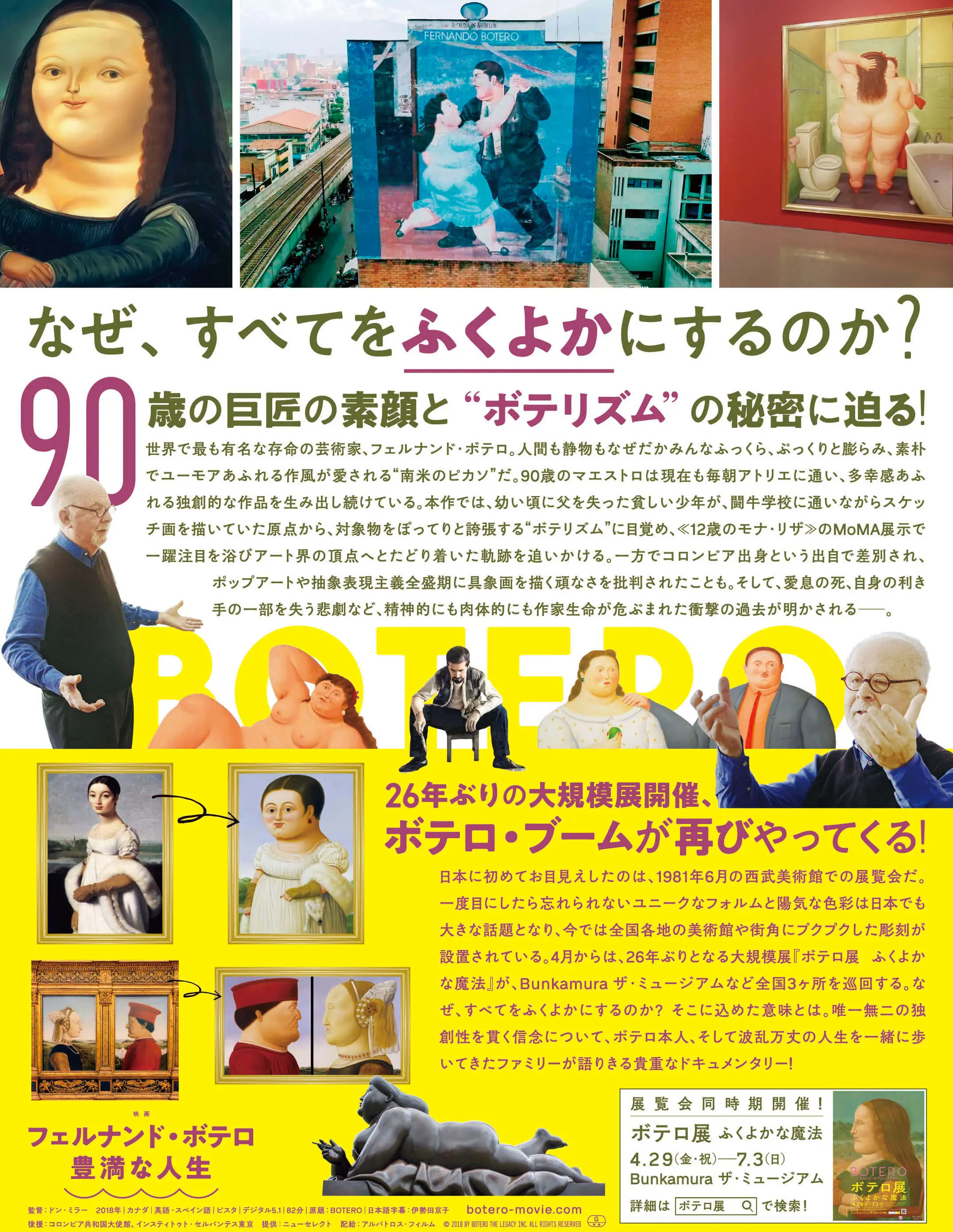 フェルナンド・ボテロ 豊満な人生 過去の上映作品 [上映日程]6/25~7/8(休映:6/27、7/4) “ ふくらむ、幸せ。”なぜ、すべてをふくよかにするのか?90歳の巨匠の素顔と“ボテリズム”の秘密に迫る! [INTRODUCTION] 世界で最も有名な存命の芸術家、フェルナンド・ボテロ。人間も静物もなぜだかみんなふっくら、ぷっくりと膨らみ、素朴でユーモアあふれる作風が愛される“南米のピカソ”だ。90歳のマエストロは現在も毎朝アトリエに通い、多幸感あふれる独創的な作品を生み出し続けている。本作では、幼い頃に父を失った貧しい少年が、闘牛士学校に通いながらスケッチ画を描いていた原点から、対象物をぽってりと誇張する“ボテリズム”に目覚め、《12歳のモナ・リザ》のMoMA展示で一躍注目を浴びアート界の頂点へとたどり着いた軌跡を追いかける。一方でコロンビア出身という出自で差別され、ポップアートや抽象表現主義全盛期に具象画を描く頑なさを批判されたことも。愛息の死、自身の利き手の一部を失う悲劇など、精神的にも肉体的にも作家生命が危ぶまれた衝撃の過去が明かされる──。 日本に初めてお目見えしたのは、1981年6月の西武美術館での展覧会だ。一度目にしたら忘れられないユニークなフォルムと陽気な色彩は日本でも大きな話題となり、今では全国各地の美術館や街角にプクプクした彫刻が設置されている。4月からは、26年ぶりとなる大規模展『ボテロ展 ふくよかな魔法』が、Bunkamuraザ・ミュージアムなど全国3ヶ所を巡回する。なぜ、すべてをふくよかにするのか?そこに込めた意味とは。唯一無二の独創性を貫く信念について、ボテロ本人、そして波乱万丈の人生を一緒に歩いてきたファミリーが語りきる貴重なドキュメンタリー! 『フェルナンド・ボテロ 豊満な人生』 [2018年/カナダ/英語・スペイン語/ビスタ/82分] 監督:ドン・ミラー 出演:フェルナンド・ボテロ、ほか 原題:BOTERO 配給:アルバトロス・フィルム © 2018 by Botero the Legacy Inc. All Rights Reserved [上映時間] [公式サイト] botero-movie.com ▶︎ボテロ展 ふくよかな魔法 botero2022 Tweet Share Hatena Pocket RSS feedly Pin it 過去の上映作品 シャンタル・アケルマン映画祭 ツユクサ ピックアップ記事 現在上映中の作品 代々木ジョニーの憂鬱な放課後【11/21~12/4】*入場者... 現在上映中の作品 現在上映中の作品 佐藤さんと佐藤さん【11/28~12/18】 現在上映中の作品 現在上映中の作品 落下の王国 4Kデジタルリマスター【11/28~】*入場者特... 現在上映中の作品 関連記事一覧 過去の上映作品 海がきこえる 過去の上映作品 戦雲(いくさふむ) *4月のPICK UP MOVIE 過去の上映作品 金の糸 *6月のPICK UP MOVIE 過去の上映作品 ブリジット・ジョーンズの日記 4Kレストア 過去の上映作品 太陽と桃の歌 過去の上映作品 ビヨンド・ユートピア 脱北 過去の上映作品 イル・ポスティーノ 4Kデジタル・リマスター版 過去の上映作品 梟ーフクロウー