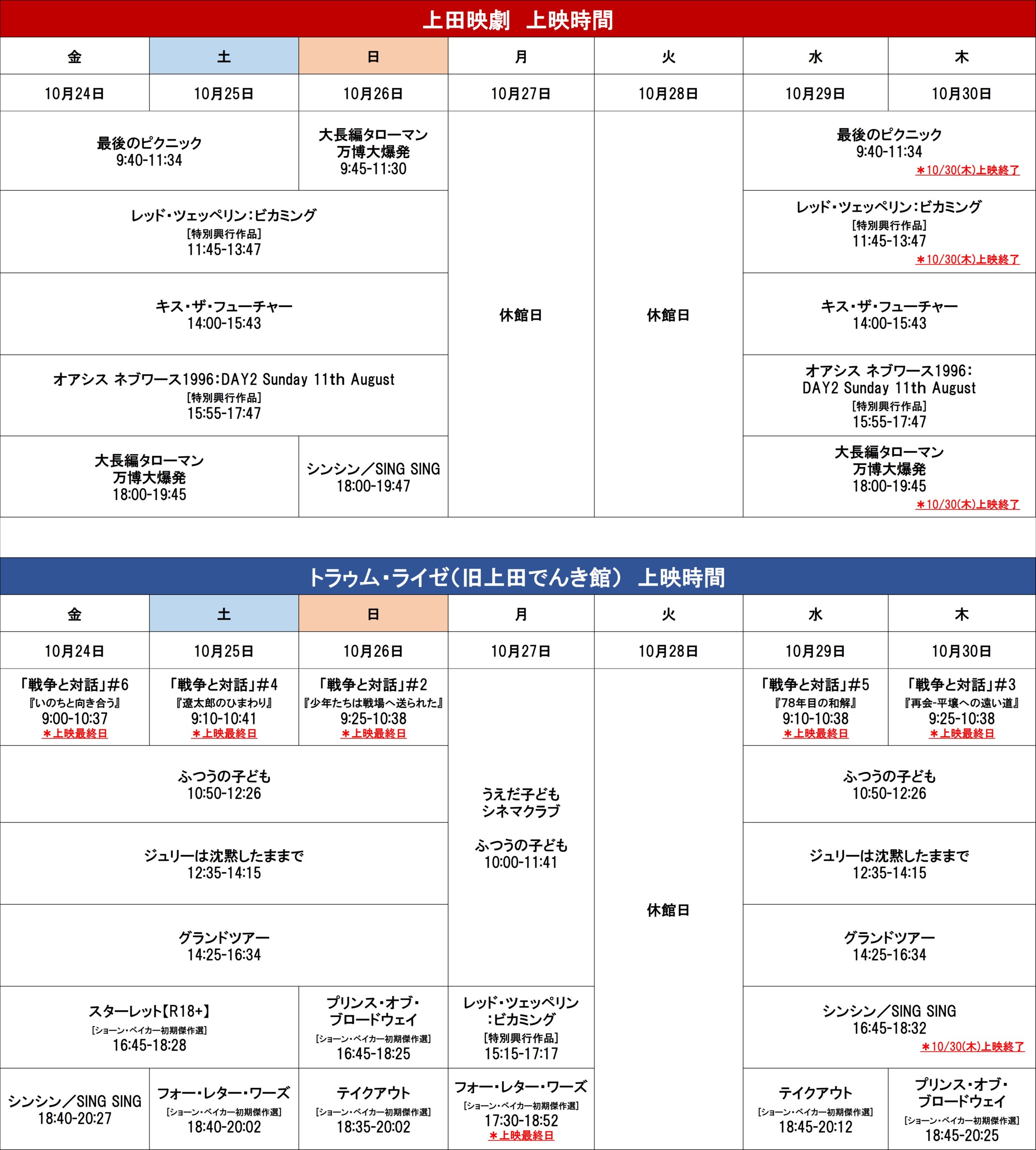 上映時間 【10月17日~10月23日】上映時間 【10月24日~10月30日】上映時間 上映時間【10月17日~10月23日】 上映時間【10月24日~10月30日】 *【10月31日~11月6日】の上映スケジュールは、11月23日(木)の夜以降に更新予定です。 各回完全入替制・自由席となります。 通常の映画上映に関しては、特にご予約の必要はございません。 上田映劇、トラゥム・ライゼ(旧上田でんき館)の2館にて上映を行っております。上映時間及び上映劇場にご注意ください。また、劇場の場所及び駐車場につきましては、こちらをご確認ください▶︎【アクセス】 当館は、幕間に予告編を上映し、上映開始時間から本編上映となります(スケジュールに記載の上映開始時刻は本編開始時刻となります)。
